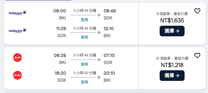 1. 台灣 → 亞庇(Kota Kinabalu, KK)